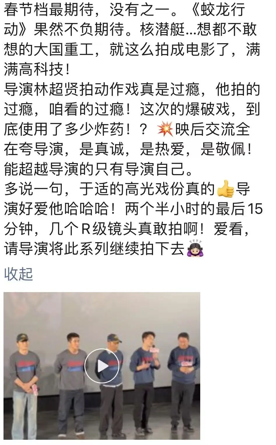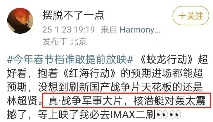 更有不少观看提前放映的观众觉得这部电影超越了《红海行动》。要知道,《红海行动》至今仍是中国实战军事动作片的“天花板”,而从观众反馈来看,这个“天花板”即将被林超贤亲手“顶穿”!